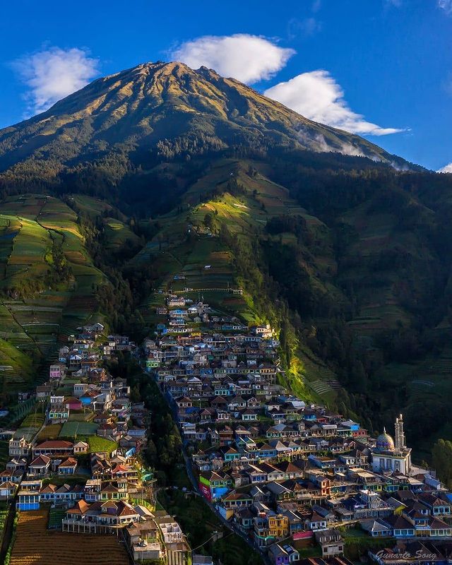 Dengan deretan rumah penduduk yang berjejer rapi di lereng gunung dan kabut tipis yang kadang menyelimuti dengan latar belakang gunung sumbing menambah nuansa seperti di pegunungan Nepal.